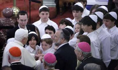 Mais l’article d’Andrea Tornielli lorsqu’il évoque les précédentes visites de Benoît XVI dans des synagogues me fait aussi et surtout pensé à la photo où l’on voyait le Saint Père entouré de jeunes enfants juifs new-yorkais dont les garçons coiffés de la kippa. Le Saint Père avait dit son émotion « à penser que Jésus enfant écoutait l’Écriture dans un lieu semblable ». C’est pour moi le plus beau et le plus complet des symboles des rapports judéo-chrétiens.