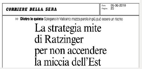 Derrière les propos du Pape sur le meurtre de Mgr Padovese: la stratégie de douceur de Ratzinger pour ne pas mettre le feu aux poudres, en Orient (Corriere della Sera. 5/6/2010)