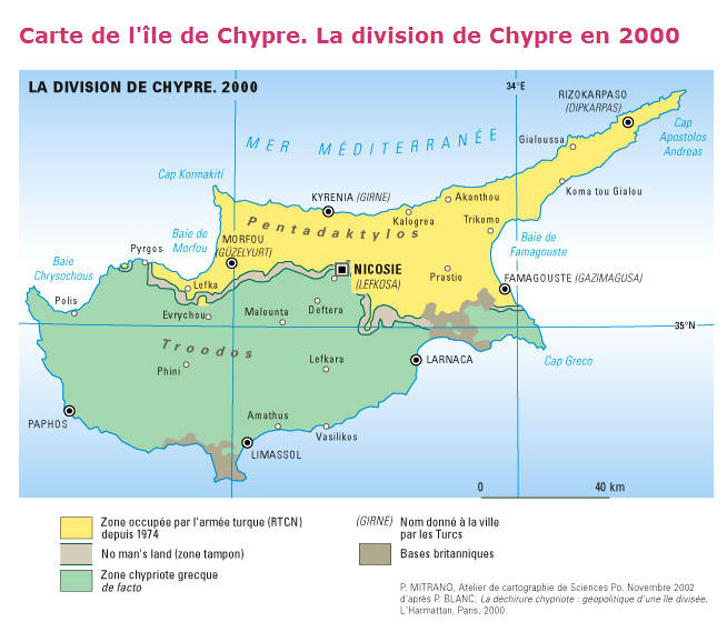 Chypre est une île située en Méditerranée orientale, souvent considérée comme européenne mais située au sud de l'Anatolie (partie asiatique de la Turquie moderne) et en face de la Syrie, tout en étant membre de l'Union européenne de facto pour sa partie sud, de jure pour toute l'île.