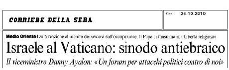 La réponse du gouvernement d'Israël a couvé pendant une journée, le temps d'achever le Shabbat et d'évaluer le message final (1) approuvé par le Synode des évêques sur le Moyen-Orient. Une réponse qui jette une ombre sur "les relations entre le Saint-Siège, Israël et les Juifs", méditée et très dure: "Le synode a été pris en otage par une majorité anti-israélienne. Le jugement est tombé hier, du vice-ministre des Affaires étrangères d'Israël, Danny Ayalon: "nous exprimons notre déception parce que cet important synode est devenu un forum pour les attaques politiques contre Israël, dans la meilleure tradition de la propagande arabe."