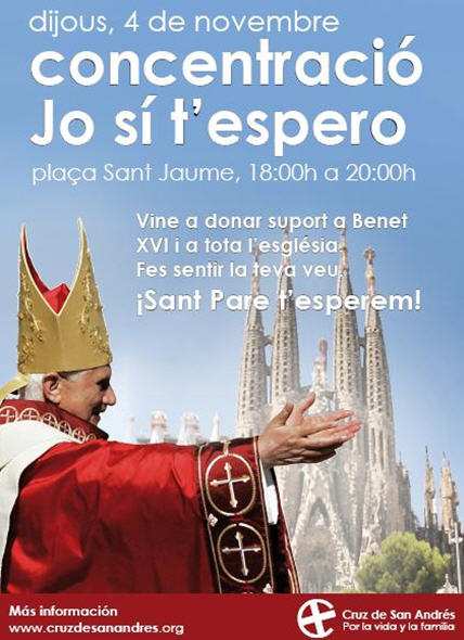Et tandis que les syndicats préparent à Barcelone une grève des autobus pour protester contre sa visite, sans oublier les embrassades à pleine bouche des paires d’homosexuels et autres inventions pavloviennes du même acabit, prévues sur le chemin du passage du Saint Père (1) , des associations très efficaces et sympathiques s’activent comme celle de la Croix de Saint André, comme le montre sa belle affiche (Organisation d’un rassemblement le 4 novembre pour montrer que le Pape est attendu à Barcelone).