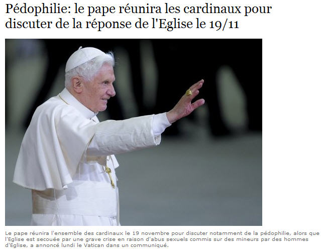 « “Italie : les cardinaux vont réfléchir à une réponse de l’Église aux affaires d’abus sexuels” (New York Times), “Le pape convoque les cardinaux sur les abus sexuels” (AFP), “Les cardinaux vont traiter des abus sexuels” (UPI), “Le pape convoque les cardinaux pour discuter des scandales sexuels et d’autres problèmes” (Canadian Press), “Les prélats vont discuter de la manière de répondre au scandale des abus sexuels” (Business Week), “Le pape va tenir un sommet sur les abus sexuels” (Wall Sreet Journal), “Le pape convoque une réunion des cardinaux sur les abus sexuels” (Washington Post), “Le pape convoque les cardinaux à Rome pour un sommet sur les abus sexuels” (Belfast Telegraph), “Le pape convoque les cardinaux pour une réunion sur les abus sexuels” (CathNews India), “Le pape convoque les cardinaux pour des discussions sur les abus [sexuels]” (Daily Nation). On pourrait poursuivre la liste, mais vous avez compris. L’une après l’autre, les manchettes des principaux journaux du monde, ont annoncé que le pape Benoît XVI avait convoqué les cardinaux à Rome pour parler des abus sexuels. Mais il ne s’agit pas de cela. Oui, le pape a convoqué les cardinaux à Rome. Et oui, le scandale des abus sexuels figure au programme. Mais il n’est pas en tête du programme ni en deuxième place. Il y a cinq thème qui sont au programme des discussions du consistoire du 19 novembre : deux sujets majeurs et trois sujets de moindre importance. La scandale des abus sexuels fait partie des sujets de moindre importance. Toutefois, à lire les manchettes vous pourriez penser que le scandale est le seul sujet de discussion (faisons en partie crédit à Canadian Press qui au moins à signalé les « autres problèmes »). Quand il s’agit de traiter de l’Église catholique, les médias laïcs s’appliquent et sont disposés à traiter des abus sexuels, et de rien d’autre. Vous dites que cinq évêques anglicans entrent dans l’Église romaine ? Vous dites que cinquante personnes ont été massacrées dans une église catholique de Baghdad ? Super. On pourrait en faire des sujets pour les dernières pages. Mais pour la manchette, qu’avez-vous de neuf sur les abus sexuels ? ».