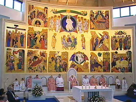 Le "complexe paroissial" a été conçu ultérieurement, par deux architectes appartenant au chemin néocatécuménal, dont le fondateur, Kiko Argüello, a réalisé personnellement les peintures derrière l'autel (très belles). Disons que l'édifice, de forme octogonale, n'a pas absolument un style "classique", mais qu'il est beau.