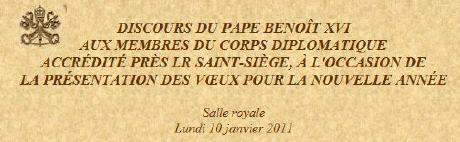 C'est le "fil rouge" du discours du Saint-Père au Corps diplomatique, thème déjà présent dans le message de la Journée Mondiale pour la Paix de 2011. Mais pas seulement. Autres temps forts (10/1/2011)