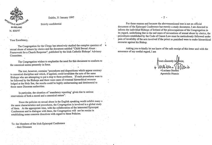 1. La chaîne de télévision irlandaise RTE s'est procurée (on sait ce que signifie ce terme convenu!) une pièce à conviction prétendument accablante pour le Vatican, prouvant sa volonté d'enterrer les affaires de pédophilie. Reprise immédiatement par le NYT, qui ne veut pas lâcher son os! Il s'agit d'une lettre du nonce en Irlande, l'archevêque Luciano Storero, datant de janvier 1997, et adressée aux évêques irlandais.