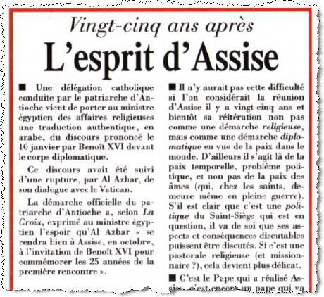 - De même qu’il y a eu un « esprit du Concile » terriblement ravageur en ce qu’il rejetait tout ce qui lui était antérieur, de même on distingue un « esprit d’Assise » niveleur en ce qu’il incite à croire que toutes les religions sont de même nature et convergent également vers le bien. Pour que la parole soit enfin officiellement libérée en décembre 2005 sur l’« esprit du Concile », il a fallu que passent et s’estompent quarante années et trois papes. Pour qu’elle soit officiellement libérée sur l’« esprit d’Assise », il faudra peut-être beaucoup moins. Ce pourrait être, pourquoi pas, l’inattendu d’octobre.