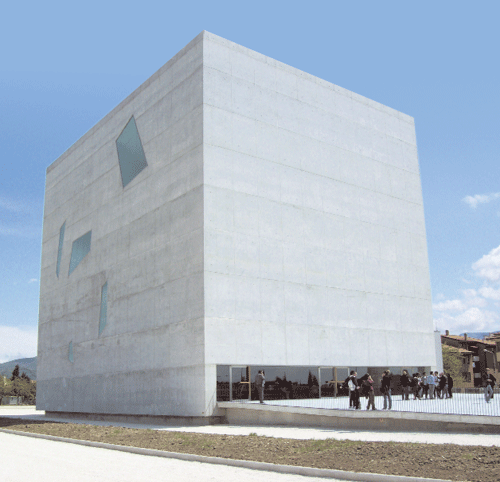 Un énorme monolithe de béton, composé de deux parallélépipède emboîtés l'un dans l'autre et reliés par des éléments en forme de tronc de pyramide, muet, contrairement aux véritables architecture qui chantent, comme le disait Enzo Paci.