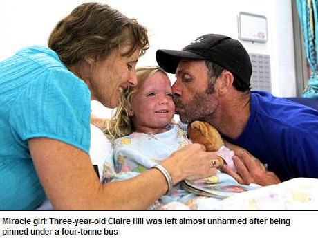 Claire Hill, trois ans est pratiquement indemne après avoir été coincée sous un bus de quatre tonnes