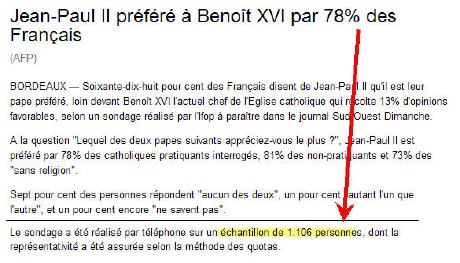 Avec de tels "correspondants" et la façon dont ils présentent l'information sur la papauté (qui est reprise, forcément, par l'ensemble de la presse), il n'est pas étonnant de lire des sondages aussi débiles que celui complaisamment présenté ici par la même AFP : oserions-nous faire observer aux désinformateurs professionnels que la grande diffférence entre Jean-Paul II et Benoît XVI... c'est que le premier est mort! (raison pour laquelle il est si aimé!)