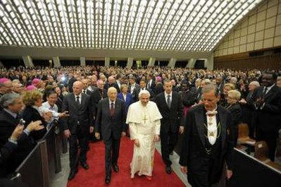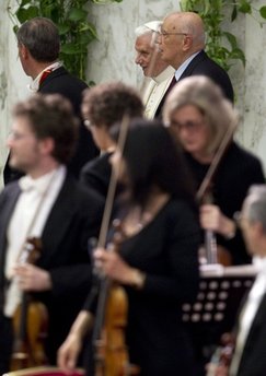 Le 5 mai, à l'occasion du sixième anniversaire du pontificat le président Giorgio Napolitano a offert, une fois encore, un concert en l'honneur du Saint-Père. Au programme, le "Credo" RV 591 d'Antonio Vivaldi et le "Stabat Mater" de Gioacchino Rossini, par l'orchestre et le chœur du Théâtre de l'Opera de Rome, dirigés respectivement par Jesús López Cobos, et Roberto Gabbiani.