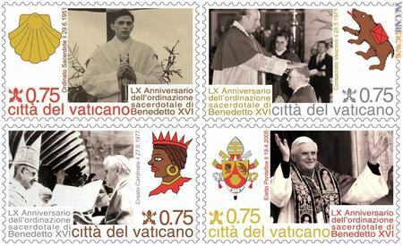 ... édités par l'Office philatélique du Vatican, pour fêter le 60e anniversaire de l'ordination sacerdotale du Saint-Père, le 29 juin prochain. (27/5/2011)