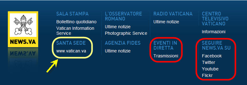 Ce que je regrette, c'est qu'il n'y ait pas dans la barre de menu du haut un bouton "Pape". Ou alors qu'il faille descendre tout à fait en bas pour trouver le lien vers le Site du Saint-Siège, dont le rôle, désormais, sera - à ce qu'il me semble - essentiellement d'archives (en particulier, justement les discours et les activités du Pape, et tous les grands textes de l'Eglise)