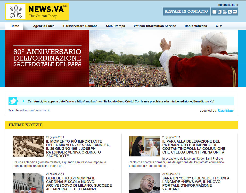 "News.va" fera ses débuts en la fête des saints Pierre et Paul, pour marquer le 60e anniversaire de l'ordination sacerdotale de Benoît XVI. Et demain (ndt: donc 28 juin), ce sera justement le Pape, pour les Vêpres, qui donnera le premier "clic" sur une tablette: la vidéo du geste historique sera ensuite sur le nouveau portail multimédia en ligne du Vatican.