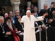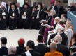 Sous les voûtes de Sainte-Marie des Anges, ils sont tous à équidistance d’un même centre habité seulement de fleurs. Benoît XVI, le pape si souvent au "sommet" des célébrations auxquelles il participe, apparaît ici à égalité avec ses invités. Une petite tache blanche au milieu des robes noires et safran, orange ou jaune, grises ou beiges des autres dignitaires religieux. Ironie de la scène : la grande majorité des hommes sont en robe, alors que Julia Kristeva, la seule femme invitée à s'exprimer, la seule aussi dans les rangs d’honneur, est en tailleur-pantalon genre Yves Saint Laurent…