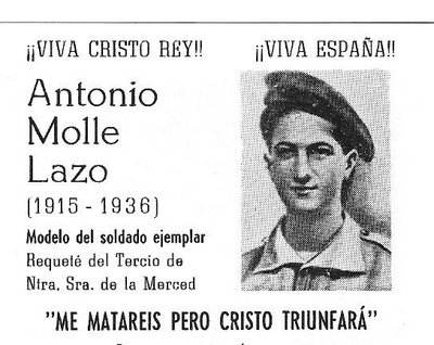 (**) Bartolomé Blanco Márquez (né en 1914), orphelin de mère à 3 ans et de père à 11 ans, issu d’un milieu très modeste, il est élevé par ses oncles et travaille très jeune comme rempailleur de chaises. Excellent orateur, il n’a que 18 ans quand il fonde dans son village natal de Pozoblanco (province de Cordoue) une section masculine de la Jeunesse de l’Action Catholique. Puis il s’intéresse à la doctrine sociale de l’Église et commence son apostolat auprès des ouvriers et il participera à des congrès à l’étranger. Quand éclate la guerre civile il est en train de faire son service militaire. De retour chez lui pour une courte permission (août 1936) il est arrêté pour son appartenance à l’Action Catholique. Ne voulant pas renier sa foi, il est fusillé le 2 octobre 1936, en criant « Vive le Christ Roi ». Il a été béatifié en 2007 par Benoît XVI (Il est fêté le 6 novembre). Voir http://www.aciprensa.com/.