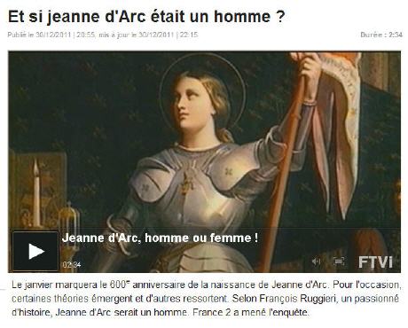 "Mon mari et mes fils regardaient les informations ce soir, je crois que c'était sur France 2 avec Marie Drucker, et évidemment au journal de vingt heures, mine de rien , un reportage sur le mystère de Jeanne d'Arc, que c'était peut-être en fait un homme, prince de sang, fils du roi Charles VI, que c'était peut-être une prostituée qui aurait été brûlée à Rouen (donc que dans la prison et pendant le jugement c'était la prostituée, enfin je suppose). Ils ont interviewé un "écrivain" nommé Ruggieri. Je ne suis pas restée car cela m'énervait trop et je faisais la cuisine, donc bonne excuse. Mais vraiment c'est révoltant, et tout cela pour parler du 6 janvier date de naissance de Jeanne d'Arc. C'est vraiment cousu de fils blancs, ils sont prêts à tout, à tout...pour discréditer la France et ceux qui croient encore en elle et qui veulent se battre pour elle...Ils en sont arrivés là. Eux qui pourtant ne croient à rien, cela montre bien que Jeanne les dérange...."