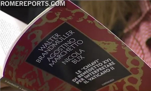 Aujourd'hui, alors que l'Eglise se prépare à célébrer les 50 ans de ces assises, inaugurées le 11 octobre 1962 par Jean XXIII, a été présenté dans la salle Marconi de Radio Vatican le livre «Le ‘chiavi’ di Benedetto XVI per interpretare il Vaticano II» (Les clés de Benoît XVI pour interpréter Vatican II), écrit par le cardinal Walter Brandmüller (ndt: né en 1929 en Bavière, créé cardinal par Benoît XVI en 2010, historien, sa thèse d'habolitation porte sur Concile de Pavie-Sienne [1423-24], ), Mgr Agostino Marchetto (né en 1940, Secrétaire émérite du Conseil pontifical pour la Pastorale des Migrants et des Personnes en Déplacement) et Mgr Nicola Bux, (déjà rencontré dans ces pages)