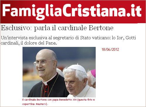dans l'hebdomadaire "Famiglia Cristiana". Pas de révélations, mais des confirmations. Le cardinal pense à un "complot médiatique". Extraits (18/6/2012)