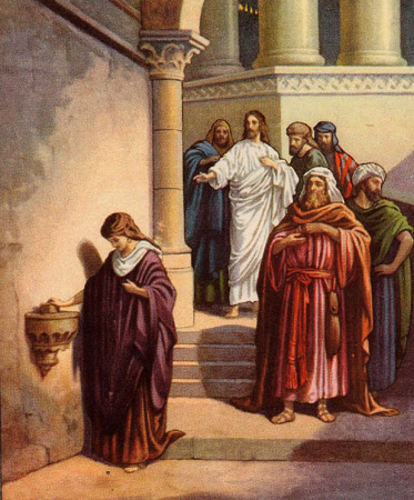 Marc, 12, versets 41-44, ou Luc 21, versets 1-4. Peu de temps avant la dernière semaine tragique à Jérusalem, Jésus est dans le temple. Il y a le trésor, les offrandes d'argent des fidèles du temple que les prêtres utilisent pour les sacrifices ou pour aider les pauvres. Ce sont des contributions volontaires, et non pas des impôts, q'ils réclament pour l'entretien du temple et subvenir à leurs besoins. Jésus et ses disciples observent «comment» les fidèles font leurs offrandes. Ils voient les riches qui jettent ostensiblement beaucoup de pièces. Et puis arrive une veuve, qui offre «deux piécettes», une offrande insignifiante. Pour Jésus, c'est la veuve, pas les riches qui sont «généreux», non pas tant parce qu'elle a «pensé» à faire l'offrande - elle aurait même objectivement pu s'en dispenser - ou parce qu'elle a donné les deux piécettes à Yahvé ou aux pauvres plus pauvres qu'elles, mais parce que, dans ce don misérable, elle a a donné «tout ce qu'elle avait pour vivre».