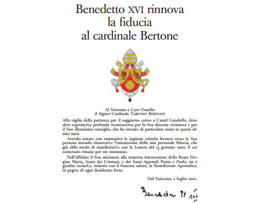 Juste avant de partir se reposer à Castelgandolfo, le Saint-Père renouvelle sa confiance à son Secrétaire d'Etat. (5/7/2012)