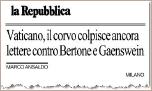 A peine le Pape rentré de Rome, les corbeaux recommencent leurs attaques, à travers le plus complaisant des relais, le quotidien "Repubblica". Un commentaire de Salvatore Izzo, adressé personnellement à mon amie Raffaella (4/6/2012, mise à jour).