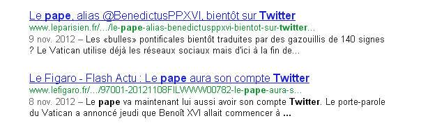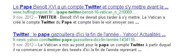 Le Pape sur Twitter: le sujet passionne les medias - comme en témoigne cette capture d'écran sur la page actualités de Google - pour des raisons en général superficielles dont presque aucune n'est digne d'attention.