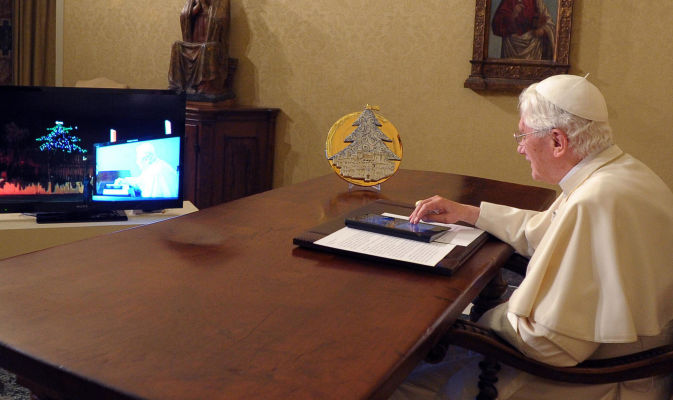 Image ci-dessus: Le 7 décembre 2011, Benoît XVI inaugurait sur un ipad les illuminations d'un sapin électronique géant, à Gubbio (https://www.benoit-et-moi.fr/archives/2011-III).