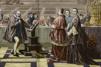 Et maintenant, un siècle plus tard, à Rome, le pape Urbain VIII faisait encore preuve de mansuétude à l'égard de son bizarre élève, Galilée (tout simplement parce qu'il lui était sympathique). C'est seulement le 22 juin 1633 que le pontife l'obligea enfin à rétracter ses erreurs en public devant l'inquisition, dans la salle des actes du cloître Santa Maria Sopra Minerva derrière le Panthéon. Et c'était déjà là tout 'le cas Galilée'.