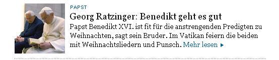 Un petit reportage (pas lumineux, mais quand même sympathique) du journal de Ratisbonne, le Mittelbayerische. Benoît XVI est prêt pour les éprouvantes célébrations de Noël (24/12/2012)