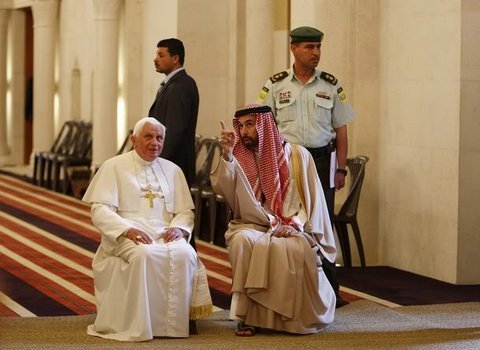 Photo ci-contre: Le Pape et le Prince Ghazi Ben Mohammed Ben Talal. Visite à la mosque Al-Hussein Bin-Talal à Amman, le 9 mai 2009