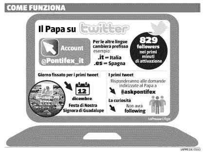 Greg Burke, le nouveau consultant pour la communication de la Secrétairerie d'Etat explique: «On a choisi Twitter plutôt que Facebook, parce que le premier est plus facile à gérer et permet de transmettre le message rapidement et avec facilité. Au début, on utilisera surtout pour les tweets des textes tirés de l'Audience générale et de l'Angélus».