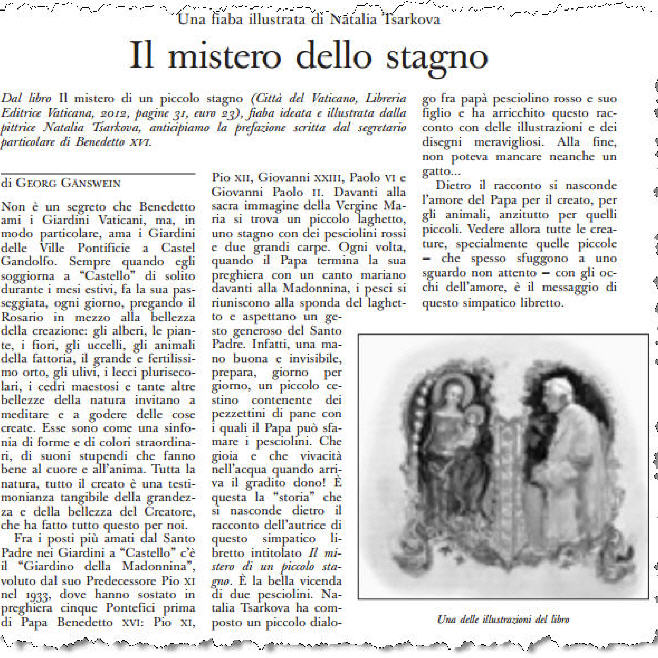 Du livre "Il mistero di un piccolo stagno" (le mystère d'un petit étang), conte imaginé et illustré par la peintre Natalia Tsarkova, nous anticipons la préface écrite par le secrétaire particulier de Benoît XVI.