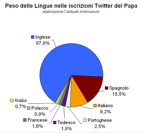 Si l'on considère que les personnes âgées sur Twitter sont en minorité (comme c'est généralement le cas sur Internet, même si elles sont en constante augmentation, par le vieillissement de chacun d'entre nous ....), on peut comprendre que tout communicateur catholique qui souhaite être pris en ligne de compte sur la scène internationale ne peut en aucun cas négliger l'anglais et l'espagnol. L'allemand, le français et les autres langues sont destinés à une minorité, non négligeable pour autant,: les leaders d'opinion catholiques qui parlent ces langues doivent être considérés. L'arabe mérite une mention spéciale : il est clair que le Saint-Siège veut donner un signe de proximité et d'intérêt pour les chrétiens qui parlent cette langue et pour les musulmans qui peuvent connaître mieux notre foi (s'ils sont intéressés....). Pourquoi pas alors le Chinois? - se demanderont certains. Pour une raison simple: Twitter n'est pas encore arrivé en Chine, il est filtré. Trop de liberté fait du mal. Si et quand il porra commencer à voleter dans ce grand pays, il est possible que le Pape commencera à tweeter en mandarin.
