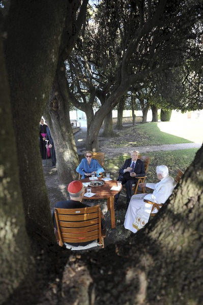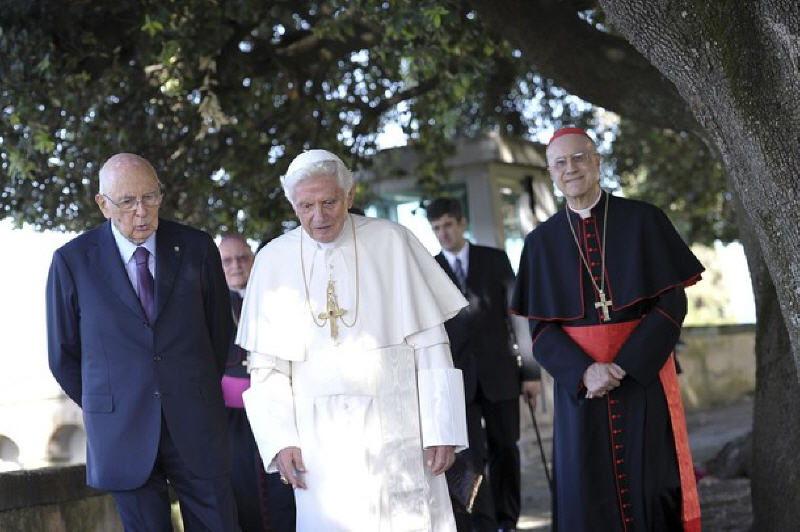 Six ans se sont écoulés depuis le début de mon mandat. Au mois de mai a commencé la dernière des sept années prévues. Je n’hésite pas à confesser que l’une des composantes les plus belles qui ont caractérisé mon expérience a été précisément la relation avec Benoît XVI. Nous avons découvert ensemble une grande affinité, nous avons vécu un sentiment de grand respect réciproque. Mais il y a plus, quelque chose qui a fait vibrer nos cordes humaines. Et je lui en suis très reconnaissant. Aujourd’hui, par exemple, nous avons passé un moment ensemble caractérisé précisément par une grande simplicité humaine. Nous nous sommes promené, nous avons parlé comme des personnes qui ont une relation d’amitié sincère, avec tout le respect que j’ai pour lui et pour son très noble ministère, pour sa très haute mission. Nous nous sentons dans un certain sens proches, notamment parce que nous sommes appelés à gouverner des réalités complexes. Le Pape naturellement, outre un «chef d’Etat», est également et surtout le guide de l’Eglise universelle. Pour ma part je me trouve au sommet des institutions de la République italienne à un moment très, très difficile. Il est nécessaire de faire prévaloir dans tout contexte de puissantes motivations de sérénité, de paix, de modération. Voilà, je ressens très fortement ma mission de modérateur: et que dire de la mission analogue qui est celle du Pape?