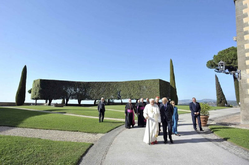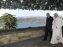 A l'issue du concert en son honneur, le Saint-Père s'est promené dans le parc surplombant le lac d'Albano avec Giorgio Napolitano, président de la République italienne. Images (12/7/2012)