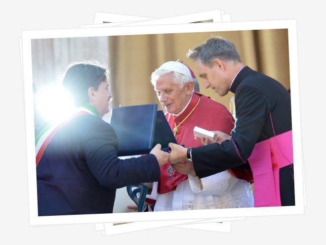 Benoît XVI a été accueilli par le nonce en Italie Adriano Bernardini et les autorités civiles. Etait également présent le cardinal Bertone, titulaire de Frascati depuis le 10 mai 2008, lorsque le pape l'a promu à l'ordre des évêques cardinaux lui allouant l'Eglise Tuscolana comme Siège titulaire.
