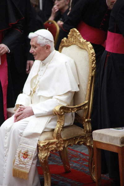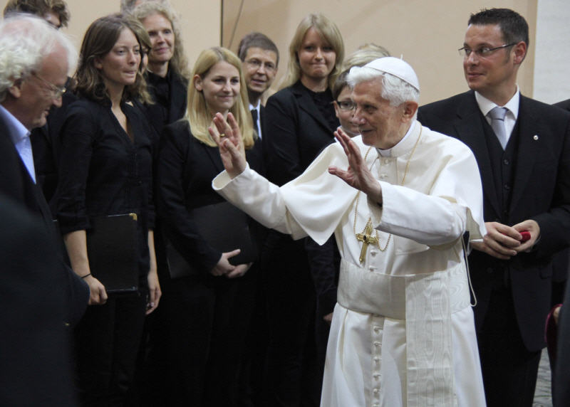 Attentif et intéressé au plus haut point, il suit les sons du Chœur de chambre de la cathédrale de Würzburg dirigé par son maître de chapelle Alexander Rüth, et ses instrumentistes. Il écoute attentivement les voix des solistes soprano féminines Endres Anke et Maria Bernius, le soprano garçon Jaromir Müller (ndt: l'enfant de 12 ans qui joue le rôle du fils de Saint Augustin), les solistes soprano masculins Hubert Nettinger, Gustavo Martín Sánchez, Manuel Warwitz, Louis Thomas, Michael et Klaus Mantaj Schredl. Les yeux du pape Benoît XVI passent du livret aux solistes, à la batterie, et aux voix masculines.