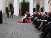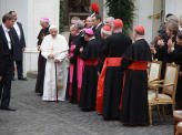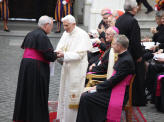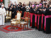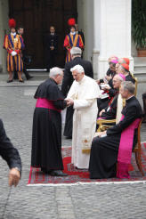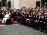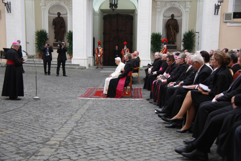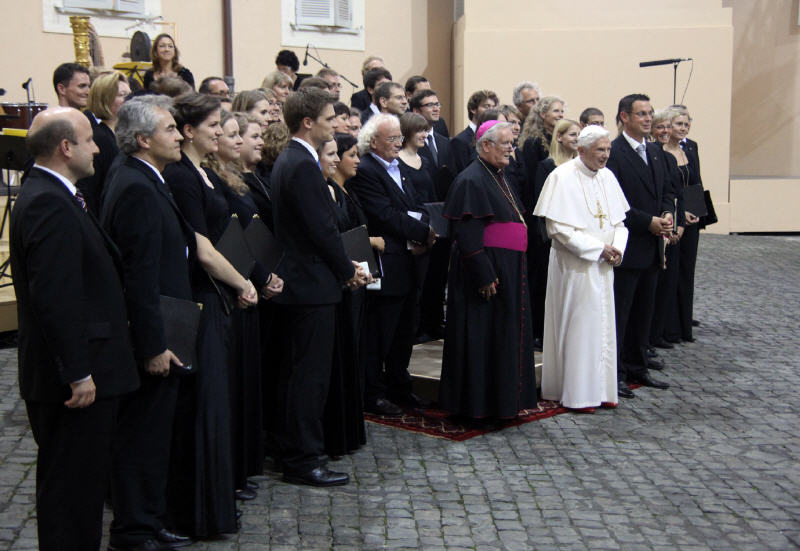 Lorsque le pape Benoît XVI prend la parole, la familiarité avec ses compatriotes de sa patrie bavaroise est immédiatement perceptible. «Cher Evêque Hofmann, Cher Monseigneur Scheele, chers invités de Wurtzbourg et de Franconie», dit-il aux quelque 200 invités d'honneur de Basse-Franconie et des environs, présents à Rome pour le Symposium sur Saint Augustin qui se tient actuellement. Avec un cordial «Merci Dieu vous bénisse» (herzlichen Vergelt’s Gott), il remercie Mgr Friedhelm Hofmann, de l'Institut Augustinien de Wurtzbourg, et tout le diocèse de Würzbourg pour le don de cette performance. Les remerciements du pape s'adressent également aux artistes du Chœur de chambre de la cathédrale de Wurtzbourg, aux solistes et instrumentistes, ainsi qu'au maître de Chapelle Berger.