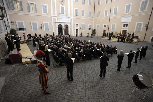 L'exécution d'une œuvre de saint Augustin ici à Castel Gandolfo est certainement un événement unique. Je remercie sincèrement tous ceux qui ce soir ont rendu cet événement possible. Un merci particulier à vous, cher Mgr Hofmann, à l'Augustinus-Institut et au diocèse de Würzburg, pour le don que vous m'avez fait de ce concert dans le cadre du Symposium international sur saint Augustin, qui se déroule à l'Augustinianum de Rome . Je remercie tout particulièrement les artistes - le Maître de chapelle, le Professeur Martin Berger, les solistes, le chœur de chambre de la cathédrale de Würzburg et tous les musiciens - pour l'exécution magistrale.