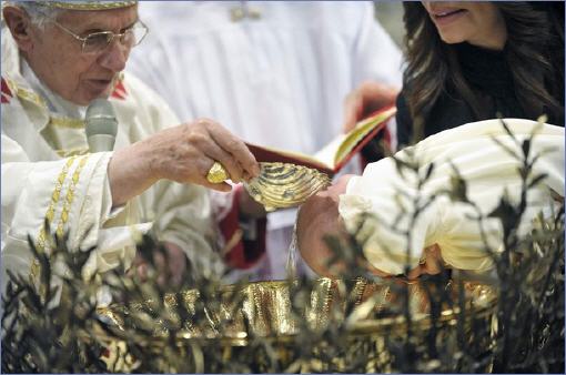 Benoît XVI a célébré la messe en la fête du Baptême du Seigneur, tout en maintenant la tradition de baptiser seize nouveaux-nés, enfants des employés du Vatican. Un rituel émouvant pour les parents et les proches, mais surtout un engagement.