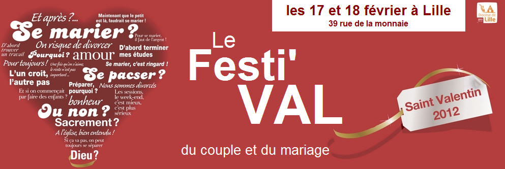 A ce sujet, Marie-Christine me confie sa perplexité devant une initiative du diocèse de Lille, relayée sur le site de la CEF (ici), à l'occasion de la Saint-Valentin: "Les 17 et 18 février 2012 aura lieu le premier « Festi'VAL » pour les couples fiancés, mariés ou aucun des deux!".