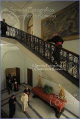 En simple tenue d'évêque il a retrouvé "ses" séminaristes pour une lectio divina a braccio (cf. La lectio divina au Séminaire de Rome). Dans le site de photos de l'OR on trouve quelques images du Saint-Père arrivant au séminaire et marchant jusqu'à la chapelle avec une canne qui disparaît lorsqu'il retrouve les séminaristes, cela me rassure surtout lorsque l'on constate avec quelle facilité il s'agenouille et se relève après un court temps de recueillement.