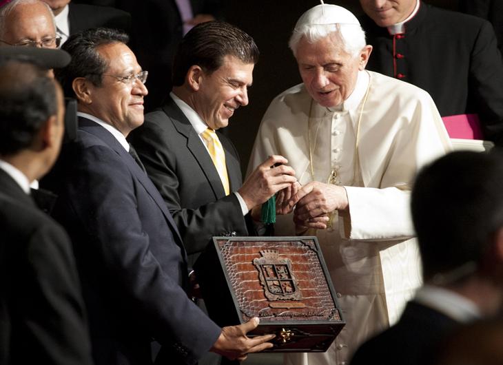 Le Maire « paniste » (ndt c'est-à-dire du parti actuel au pouvoir) de Silao, Juan Roberto Tovar, et le Gouverneur de Guanajuato, Juan Manuel Oliva, ont remis les clefs de la Ville au Pape Benoît XVI. À son arrivée à l’héliport du Parc « Bicentenario », le Souverain Pontife a reçu la reconnaissance de sa distinction d’hôte de marque. La Clef qui lui a remise a été plongée dans un bain d’or de 14 carats. Elle a, également gravée, l’image du Christ Roi que le pape a découvert lors d’un survol en hélicoptère.