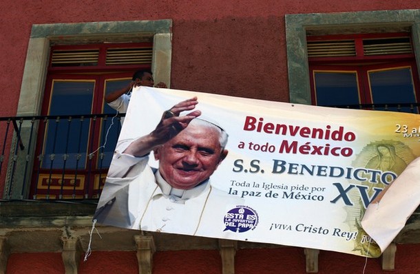 A l'arrivée au Mexique, joyeuse, enthousiaste, colorée, avec la ferveur de la foule présente pour l'accueillir à sa descente d'avion, les chants des mariachis, les enfants avec des fleurs, le tempo était donné. Bras grands ouverts avant de descendre aisément la passerelle, je n'ai pas noté le soupçon d'hésitation, de timidité peut-être, qui se manifeste souvent au moment de rencontrer tant de personnes nouvelles. Le voyage avait été calme, avec des cadeaux reçus (une tablette ipad), un éclat de rire, si rare malheureusement de la part de ce " pape technologique" et on retrouvait un Saint-Père accueilli par des jeunes en grand nombre, un couple présidentiel présent et cordial. L'épouse était souriante et malgré le qualificatif qui lui a été attribué ( pas par moi) : mal fagotée, j'ai apprécié son attention à l'égard du Saint-Père en faisant le lien avec lui et ce qui se passait. C'est elle qui a attiré l'attention du secrétaire pour qu'il récupére une enveloppe remise au Pape et qui le gênait pour saluer les personnes présentes. Lors de la présentation de la suite papale aux autorités, Mgr Gänswein s'est incliné devant le Pape mais j'ai retrouvé le geste habituel pour remettre en place, discrètement, la petite cape blanche indisciplinée; même presque invisible il veille et sa présence est, pour moi, rassurante. Impossible de reprendre tout ce que j'ai noté, tout ce qui m'a touchée, émue. Tous ces jeunes, cette foule qui l'acclamaient, les drapeaux, les visages radieux, la musique rythmée, chaude, joyeuse, les pancartes, les longs parcours en papamobile, vitres baissées, un pape souriant qui saluait, les ballons lâchés, les pluies de confettis. Pour la visite de courtoisie au Président Calderon la place est pleine, les cloches sonnent à toute volée. Tout au long de la route on remarque les magnifiques maisons mexicaines de style espagnol, colorées, décorées . Une phrase relevée sur les pancartes brandies avec enthousiasme : "que soit bénie la lumière de tes yeux, nous t'aimons", "benvenuto Benedicto XVI "sur de grandes photos du Pape. "Te queremos Benedicto".