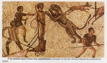 >>> Image ci-contre: Un chrétien dans l'arène d'un amphithéatre, mosaïque, musée des antiquités de Tripoli histoirencours.fr/