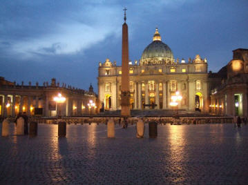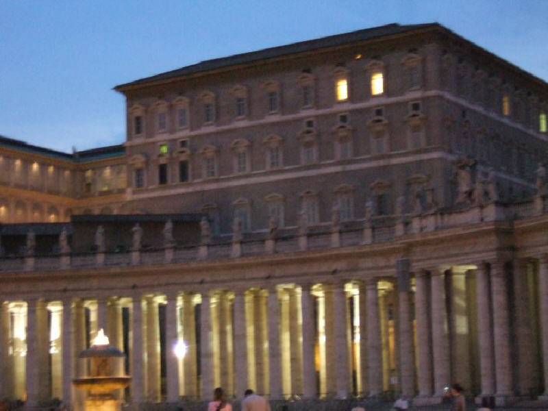 Lorsque, la nuit venue, on prend le temps de traverser la place [Saint-Pierre], on est saisi, attiré par une petite lumière qui brille, tout là-haut, dans les hauteurs du Vatican. C'est celle du bureau du Pape, qui nous rappelle, là, simplement mais clairement, la continuation de cette réalité dont la basilique conserve les reliques.