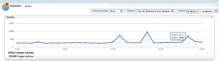 Dans une société où tout se mesure, où ce qui n'est pas mesurable n'a tout au plus qu'une valeur relative (cf. Benoît XVI) et où tout ce qui est mesurable mais ne parle pas de gros chiffres ne vaut rien, les 97520 visites de mon petit site amateur entre le 3 et le 30 juin 2013 (avec une moyenne de presque 3500 visites par jour et un record surprenant à presque 10000 visites, le 22 juin) sont pour moi une bonne nouvelle.