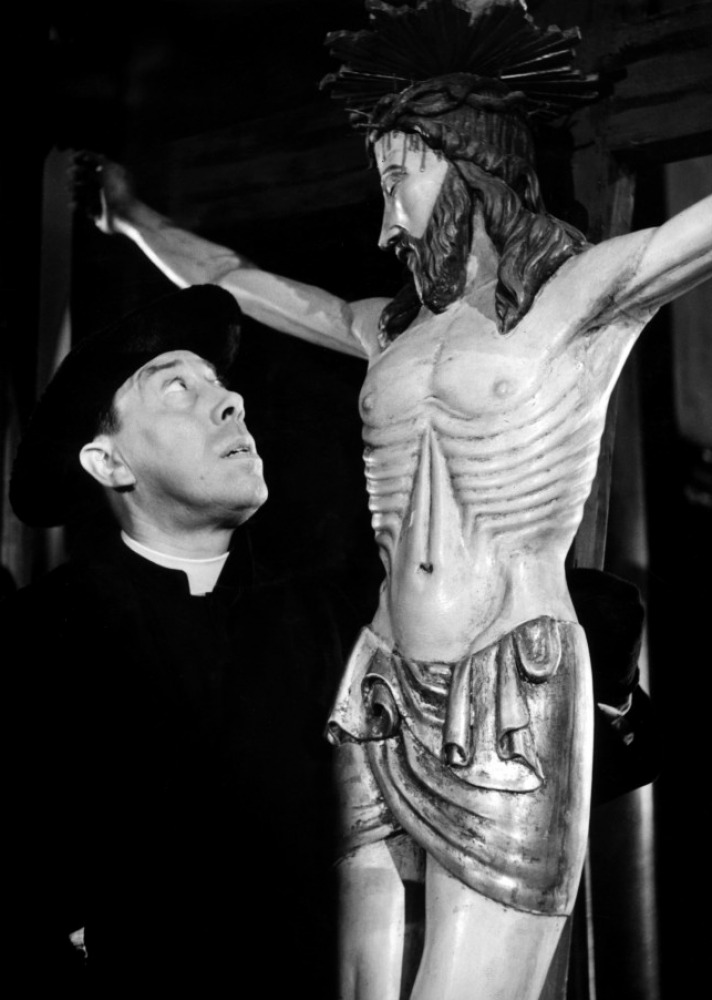 Don Camillo leva les yeux vers le Christ du maître-autel et dit