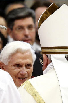 On remarquera que François portait la férule de Scorzelli. Que Benoît a ôté sa calotte, pour le saluer. Et surtout qu'il est beau (comment dire autrement?) et semble en bonne santé.