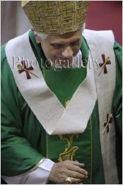 Si sa chasuble verte est plus brillante que celle des autres célébrants, en revanche, il n'est pas difficile de deviner qu'il s'agit d'une pièce unique, confectionnée et brodée - sans doute avec amour - tout exprés pour lui, de la "haute couture", en quelque sorte, par opposition aux séries "économiques" de chasubles en tissu synthétique fort laides que portent en général les évêques concélébrant avec lui. Il est évidemment au centre de l'attention générale, et c'est de sa part un signe de grand respect envers son ministère que d'offrir en toutes circonstances au monde qui l'observe une image quasiment idéale.